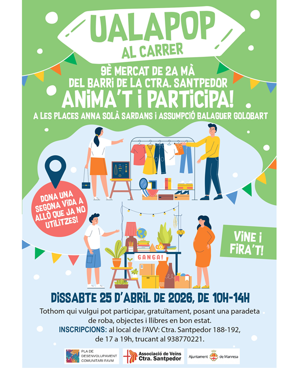 El pròxim dissabte 25 d’abril de 2026, el barri de la carretera de Santpedor tornarà a omplir-se de vida amb una nova edició de Ualapop al Carrer, el mercat de segona mà que ja s’ha convertit en una cita esperada per al veïnat.